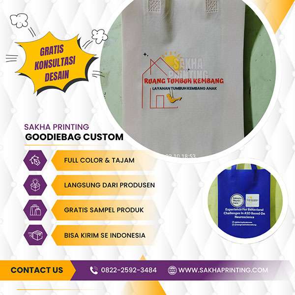 Goodie bag custom dengan bahan dan desain pilihan, pas untuk event, promosi, dan souvenir usaha.