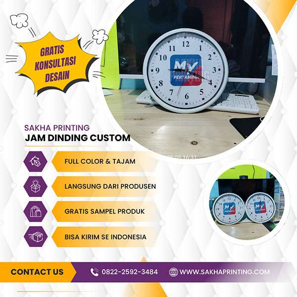 Jam dinding custom dengan logo atau desain pilihan, pas untuk promosi dan dekorasi ruang kerja.