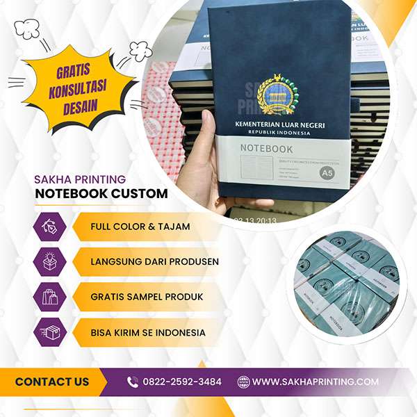 Notebook custom dengan desain sampul unik, ideal untuk souvenir, branding, dan kebutuhan kantor.