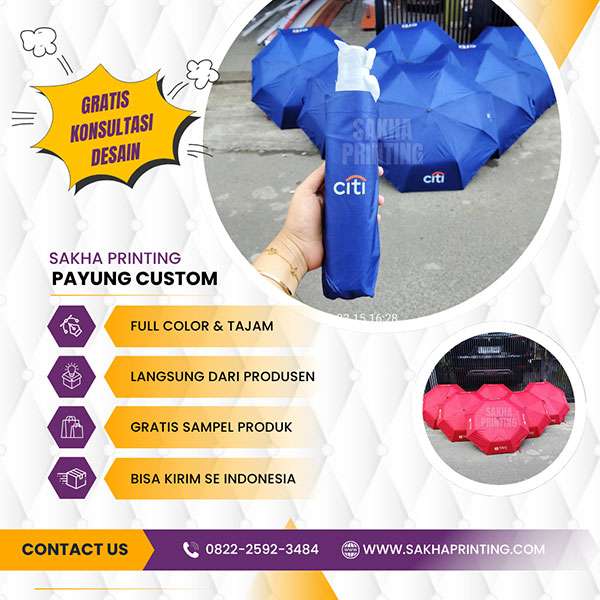 Payung custom dengan logo atau desain unik, cocok untuk promosi, souvenir, dan kegiatan outdoor.