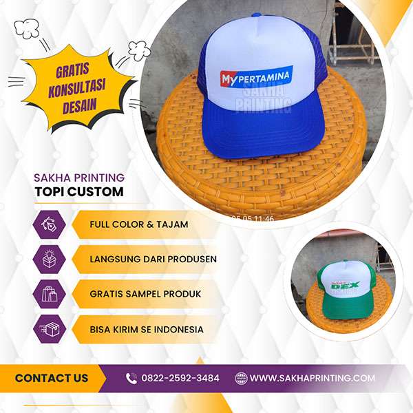 Topi custom dengan desain bebas, pas untuk branding, komunitas, event, dan gaya kasual sehari-hari.